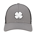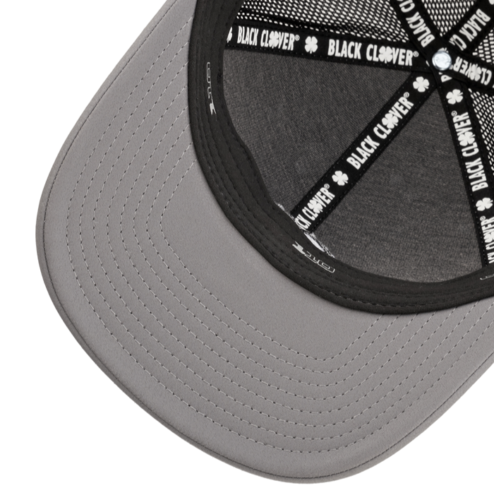 帽子本体には小さく型押しされたクローバーロゴがこだわりの印象を与えます。正面にはダークな色味にホワイトのブランドロゴが映えるシックなデザインです。