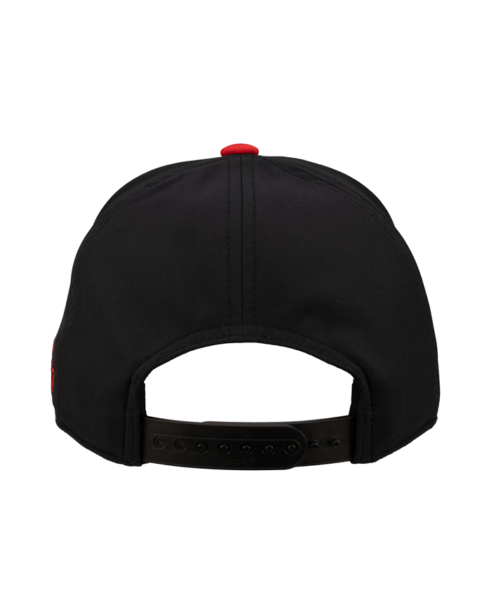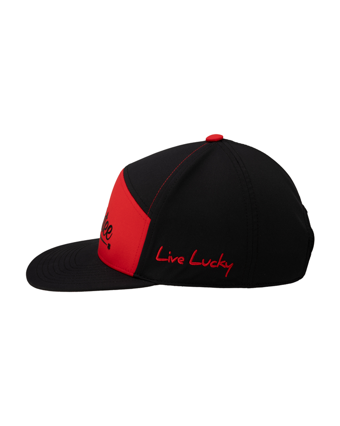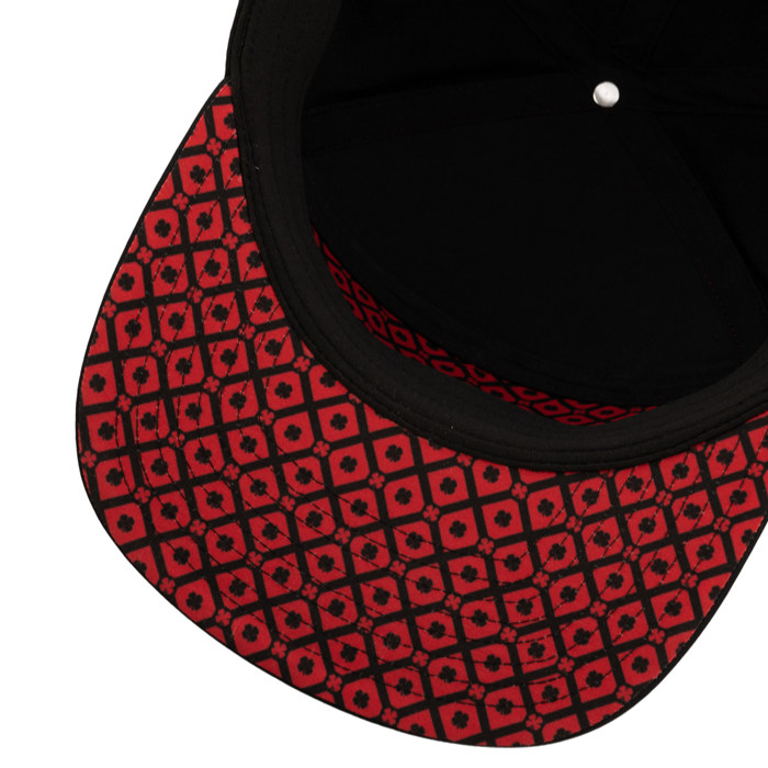 「わんぱく」の意味を持つ "NAUGHTEE" はフラットブリムの内側にもこだわりのクローバー模様をあしらっています。Black & Red の配色と遊び心を新しいワードローブに追加しましょう!