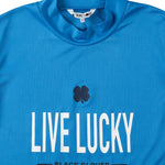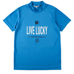 吸水速乾素材使用。肌触りも柔らかく、汗をかいてもまとわり付きずらい素材感なので、快適にプレーが出来ます。胸には、ブランドコンセプトでもあるLIVE LUCKYアイコンを記載してます。