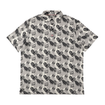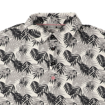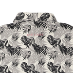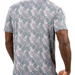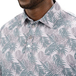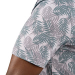 南国のリゾート感あふれるリーフ柄がポイントのプレスリー。胸元中央にクローバーマークを秘めています。スーパーソフト仕様で伸縮性が高く、速乾、発汗対応でさらっとした感触が楽しめます。イージーケア。91% ポリエステル 9% ポリウレタン。S/M/Lの3サイズ展開。全2色展開。