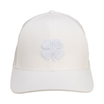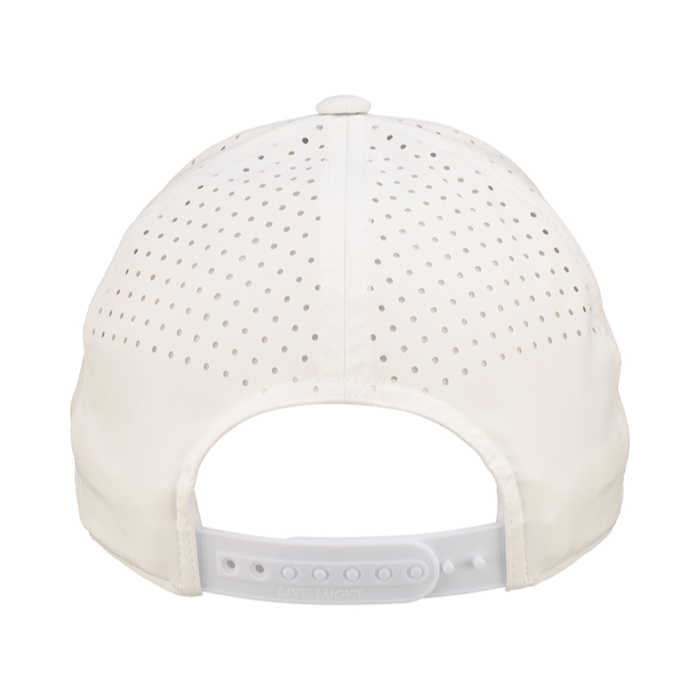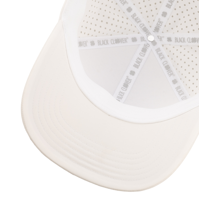 生地と同色のクローバーが立体的に刺繍されたシンプルデザインが特徴。調整可能なスナップバックに通気性の良いレーザーパンチの同色生地で機能にも優れています。