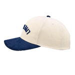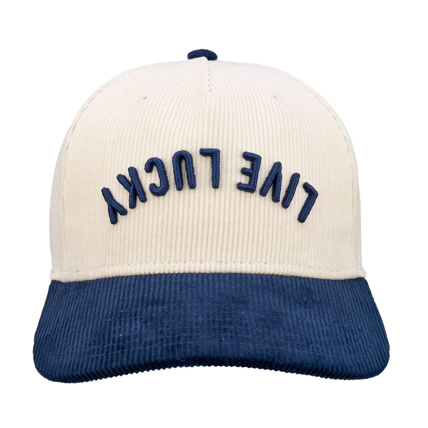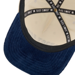 クラシックなコード素材に、クリームカラーのクラウンとネイビーのブリムを組み合わせた「CORD UPSIDE DOWN LUCK 3」。