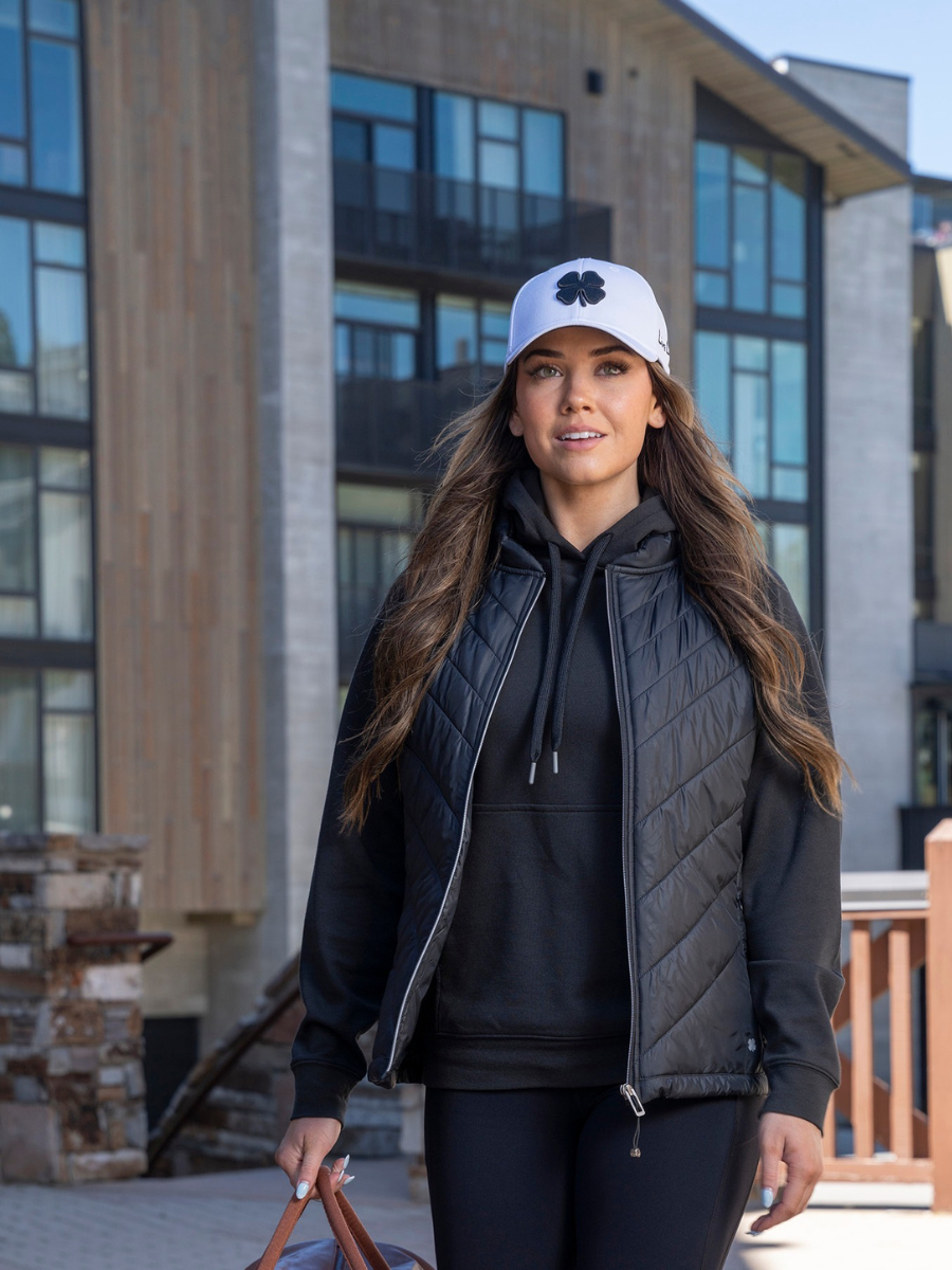デミキルティッドベストは防風性、軽量性、快適性を備えています。フィットするデザインがシルエットを引き立て、内側にジッパー付きポケットが付いているので実用的です。風の強い日に重ね着するのにぴったりで、楽なスタイルです。