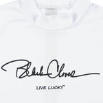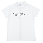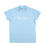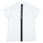 レディース モックネックTシャツ 吸水速乾素材使用。肌触りも柔らかく、汗をかいてもまとわり付きづらい素材感なので、快適にプレーが出来ます。シンプルなデザインながら背面部にトレンドラインアイコンを配備されたハイネックポロ。