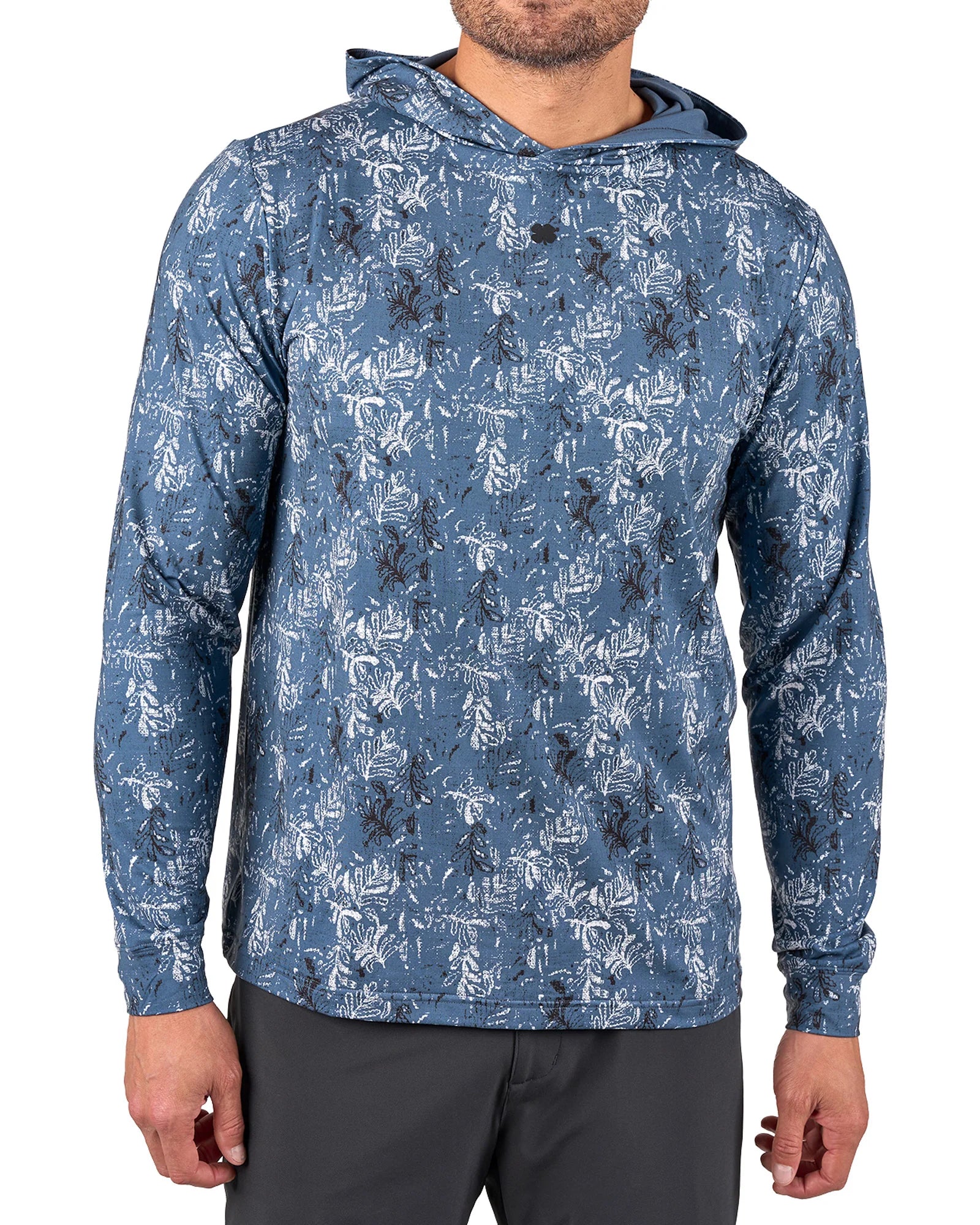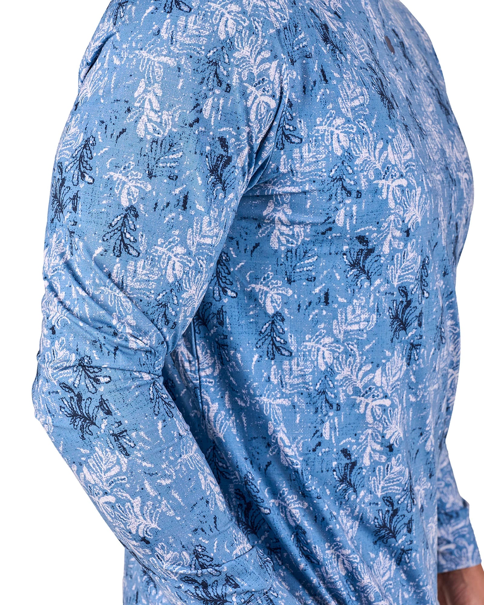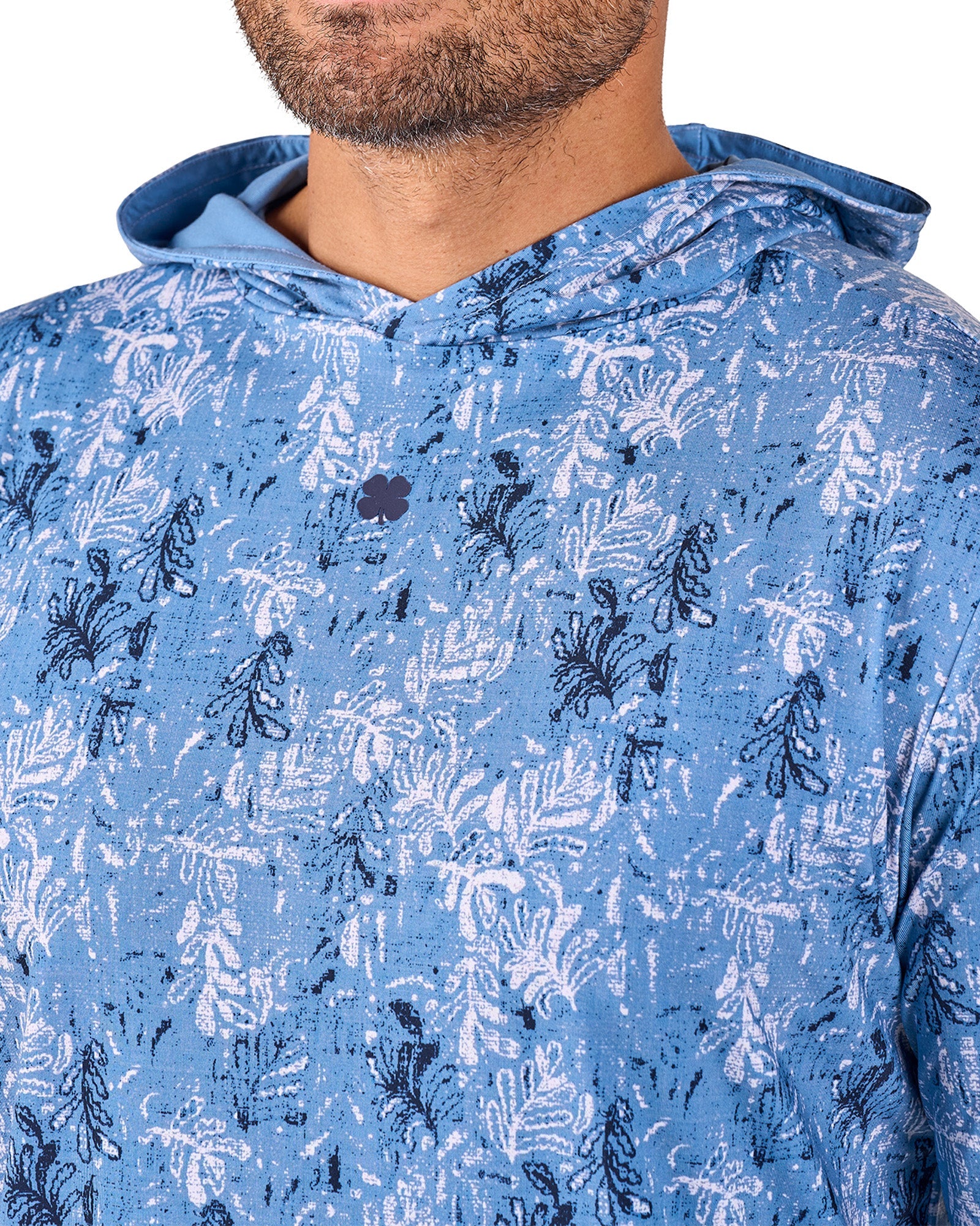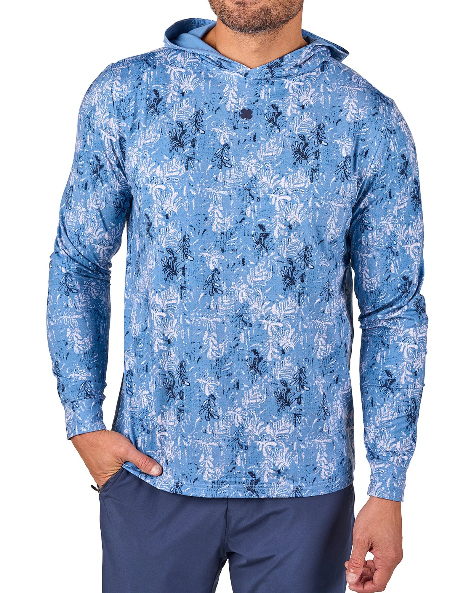 この軽量なパーカーは、ブルーとネイビーのプリントが特徴で、通気性に優れたポリスパンデックス混紡素材を使用しています。一日中快適に過ごせるようデザインされ、形状維持テクノロジー、抜群の柔らかさ、速乾性、しわになりにくい、お手入れのしやすさなど、スタイルと機能性が完璧に融合しています。